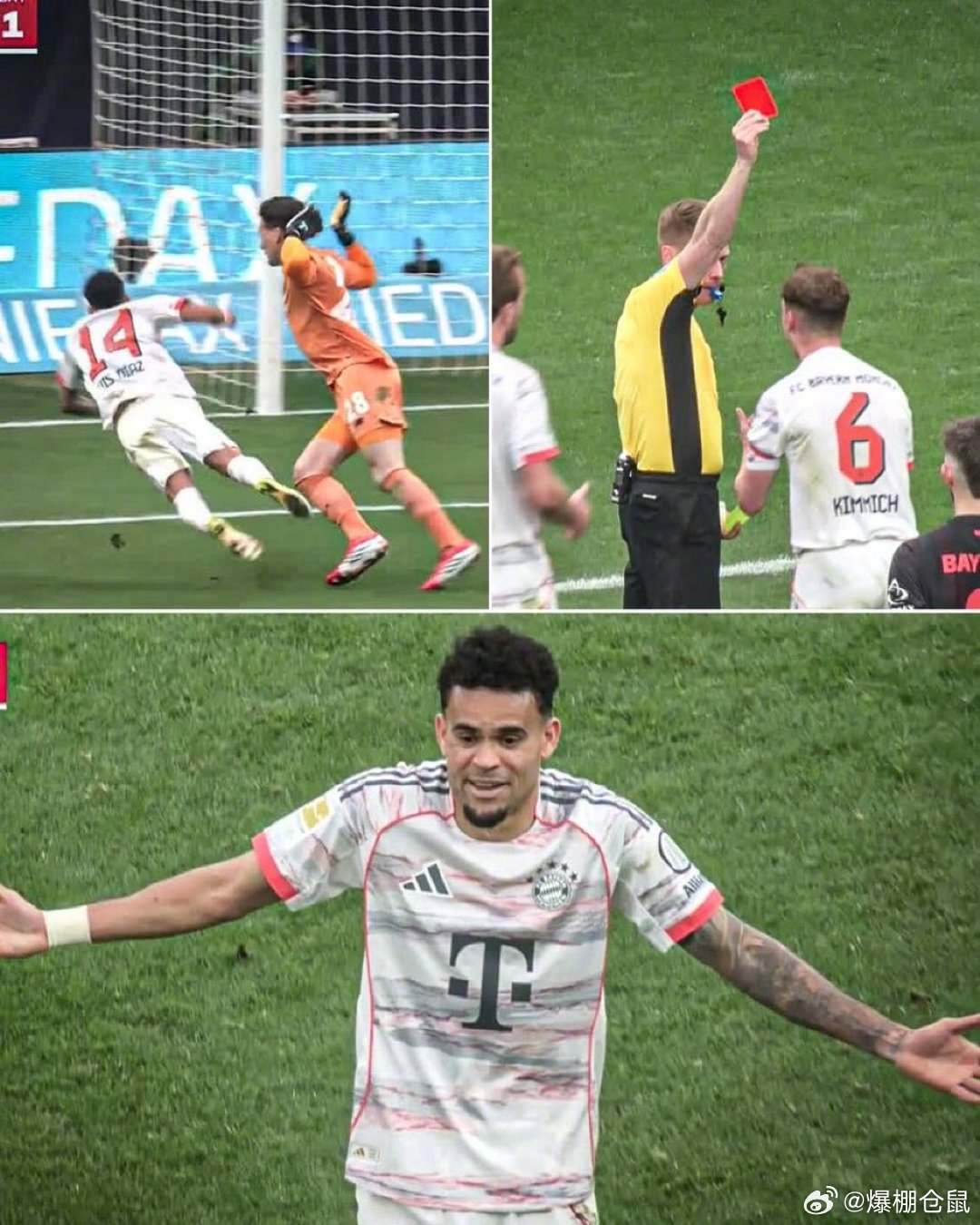 【勒沃库森1比1拜仁,拜仁两人被罚下!】雅克松飞铲泰里耶脚踝被直红罚下, 迪亚斯扳平比分,15分钟后,他假摔吃到第二黄贝罚下!德甲