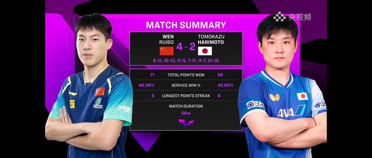 江山代有才人出, 长江后浪推前浪, 国乒终于不用王楚钦单打独斗了, 十九岁小将温瑞博挺进决赛,可喜可贺。 虽然和张本智和的对决非常焦灼, 但温瑞博表现了过硬的心理素质和专业素养, 4:2击败对手, 特别是第六局, 打到21:19, 感觉两个人都已经筋疲力尽了, 温瑞博异常出色,最终笑到最后。 祝贺祝贺, 当林诗栋出局, 当大头止步, 温瑞博站出来了, 国乒男队“后继有人”。