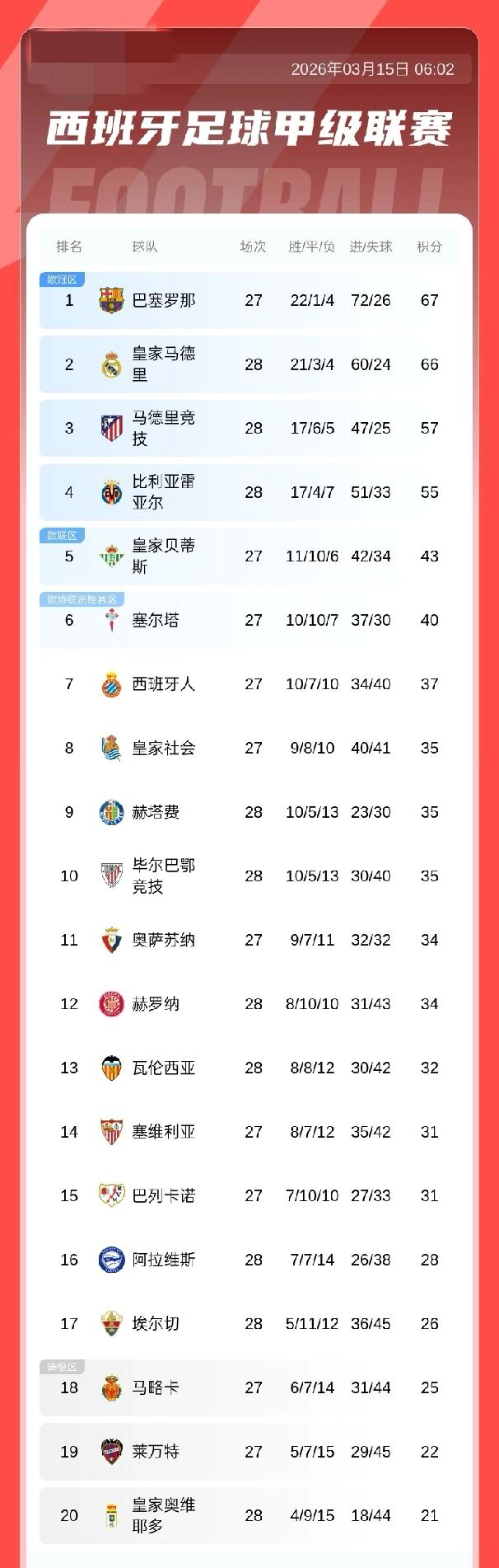 西甲积分榜:皇马先赛积66分距榜首巴萨1仅分,巴萨今晚战塞维利亚,马竞积57分第3 03月15日 西甲第28轮 皇马4-1战胜埃尔切 积分榜上:皇马先赛积66分排名第二,巴萨积67分领跑,巴萨今晚主场对阵塞维利亚,马竞积57分第3