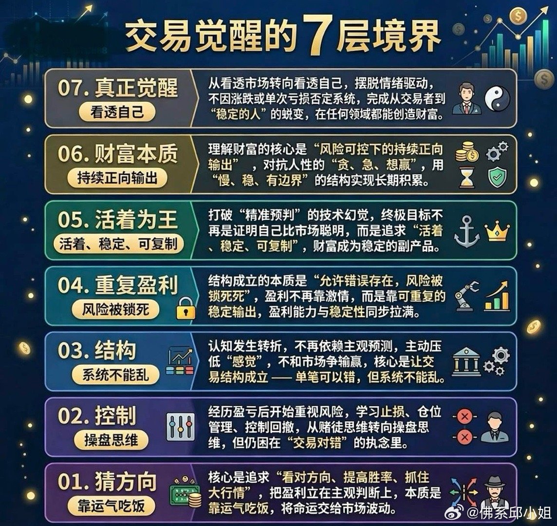 1. 猜方向:靠运气吃饭,执着于预测市场,盈亏全凭偶然。2. 控风险:学会止损与仓位管理,但仍在乎单笔对错。3. 建系统:不再主观臆测,建立交易规则,允许单笔亏损,但求系统正期望值。4. 重复盈:锁死单票仓位与总回撤风险,靠规则而非激情实现稳定输出。5. 活下来:放弃证明自己聪明,追求长期在场,让复利自然生长。6. 看本质:理解财富是风险可控下的持续正向输出,以慢为快。7. 见自己:摆脱情绪驱动,看透人性弱点,完成从交易者到“稳定的人”的蜕变。