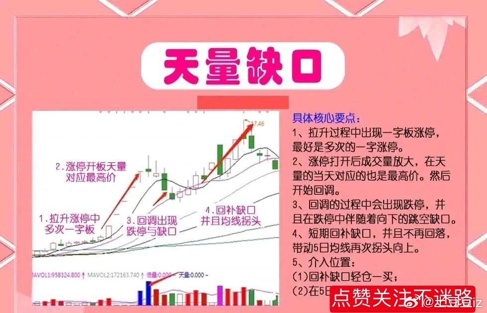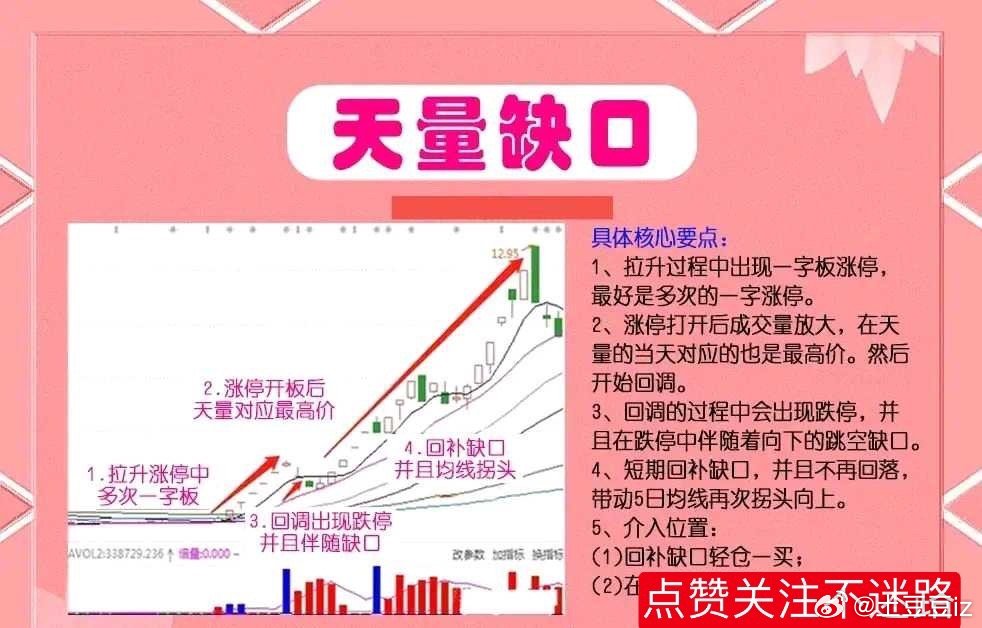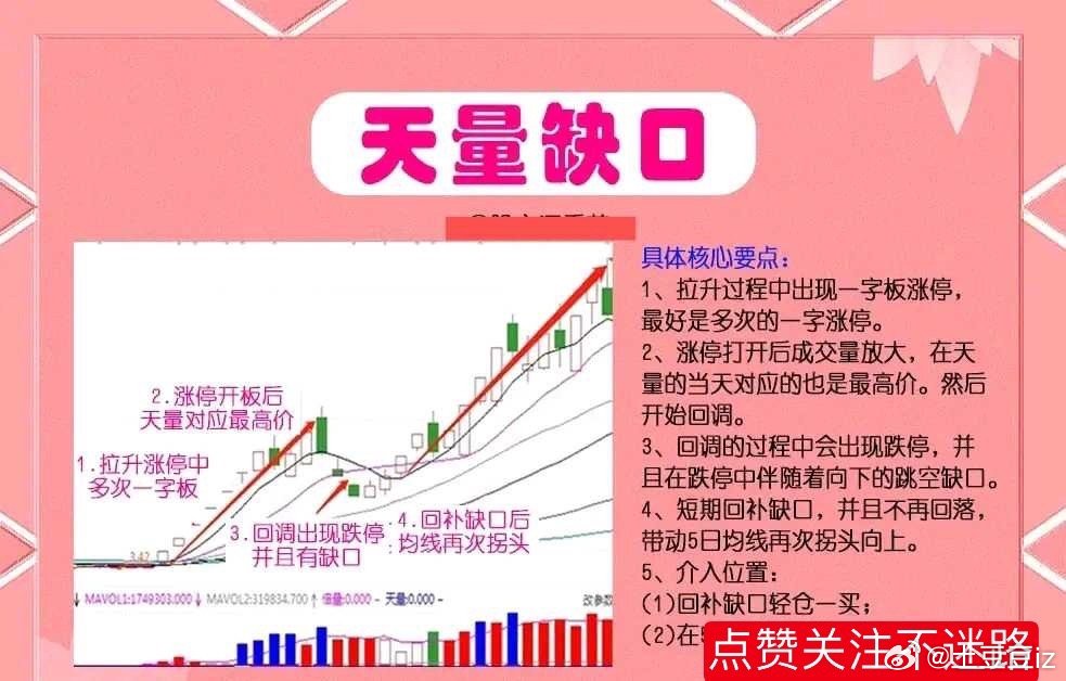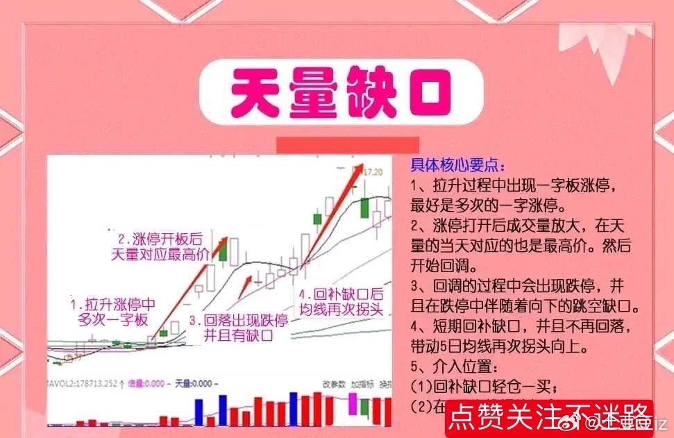 图形特征:股价整体处于低位,天量缺口就是股票出现一字板之后,这个时候没有机会介入,等开板之后往往容易出现一个天量缺口,这种时候要重视,一旦回补就是好的切入点,这种形态走势独立,一旦形态完成,就要走自己独立的拉升行情。“天量缺口”技术要点:1、在拉升过程中出现一字板,最好是多次的一字板。2、当涨停打开之后,对应的成交量是放大的,而且是当天对应的最高价,随后出现了回调。3、当回调过程当中,会出现跌停,并且在跌停中出现了跳空缺口。4、短期内回补缺口,且不再回落,并且带动5日均线再次拐头向上。5、介入位置:一是回补缺口可轻仓进场;二是在5日均线拐头加仓。底部天量:股票底部出现天量意味着个股开始有资金介入了,有投资者开始关注它了,股票底部出现天量,则有可能是主力在底部吸筹完成之后,准备拉升股价的行为,在这种情况下,股价一般会出现突破上方某一平台的压制,k线收一个大阳线。同时,底部放巨量,也有可能是主力在底部进行拉升出货操作,即主力先买入一部分股票,拉升股价,吸引市场上的跟风者买入,方便其在上方抛出手中的股票,出现这种情况,其股价不会突破上方某一重要的压制位,k线收一根较长的上影线。总之,个股在底部放巨量时,投资者可以把它与市场上的其他因素结合一起考虑,比如,资金流入流出情况、k线等等。为了方便大家理解“天量缺口”战法,制作了图文并茂放在文章下方,如果觉得对你有帮助,记得点赞关注转发给有需要的朋友。