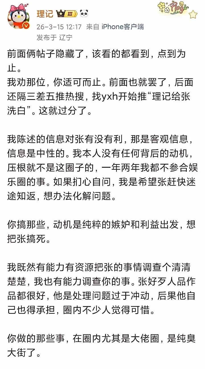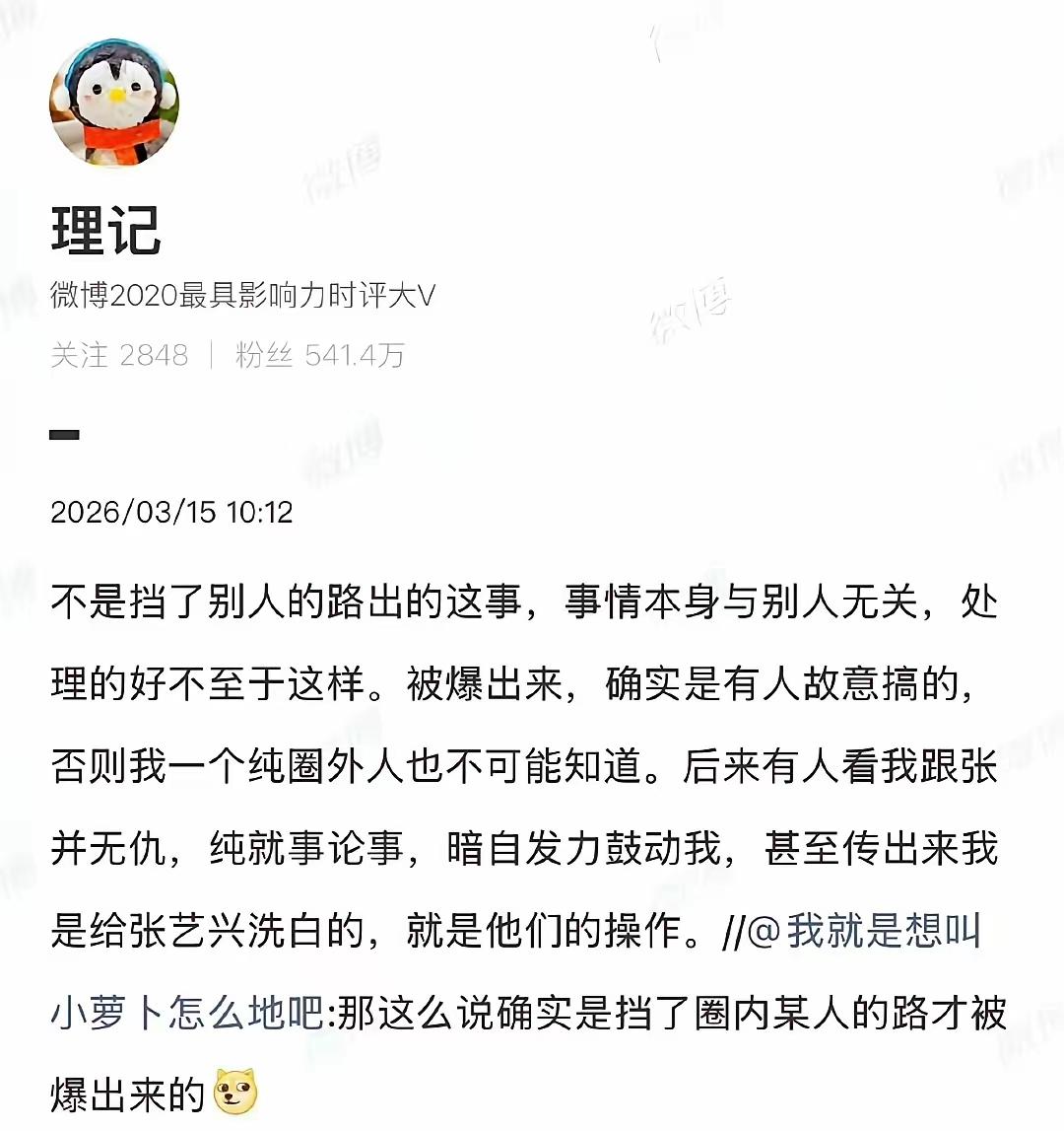 张艺兴这事越闹越真,还扯上谢娜张杰,有点看不明白! 这几天张艺兴的瓜越扒越细,本来只是零星传言,现在被微博上一个叫理记的作者一条条捋完,逻辑全对上了,可信度真的不低。 这个理记连续发长文把来龙去脉讲得明明白白:张艺兴是国家话剧院的身份,去年年底去韩国活动没按规定报备,后续又出问题,和单位谈不拢,最后被暂停线下演出审批,不是全面封杀,但晚会、综艺、商演基本都受影响。 最关键的一点,工作室发了声明,却只否认劣迹、封杀,全程没正面回应报备违规、演出受限、和国话的矛盾,等于避重就轻,没敢直接怼爆料的核心。这态度放在娱乐圈,基本就是默认了。 现在的问题是,竟然有说法说这是谢娜一手操作的,目的是为了让网友把之前关注她和薛之谦的争吵的注意力转开! 不过这一点我是不太认同的。虽然我不太喜欢谢娜,但是我也不认同谢娜有这样下作。大概率是营销号硬串瓜博流量,这俩纯属躺枪,和张艺兴这件事本身半毛钱关系没有。 圈内很多事都是这样,没实锤官方通报,但业内消息、当事人的回应态度,一看就明白。这次爆料细节全、时间线对得上,工作室又不敢正面硬刚,大概率就是真的。 吃瓜别被带偏,主线就是张艺兴自身的问题,和其他人无关,静观后续就好。