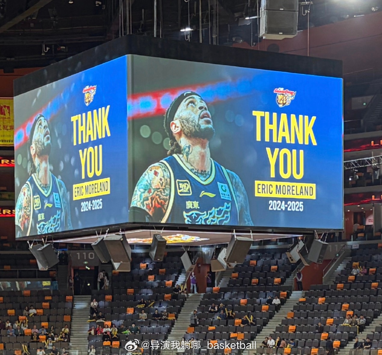 广东男篮主场赛前在大屏幕上播放视频致敬上赛季外援莫兰德广东男篮vs辽宁男篮