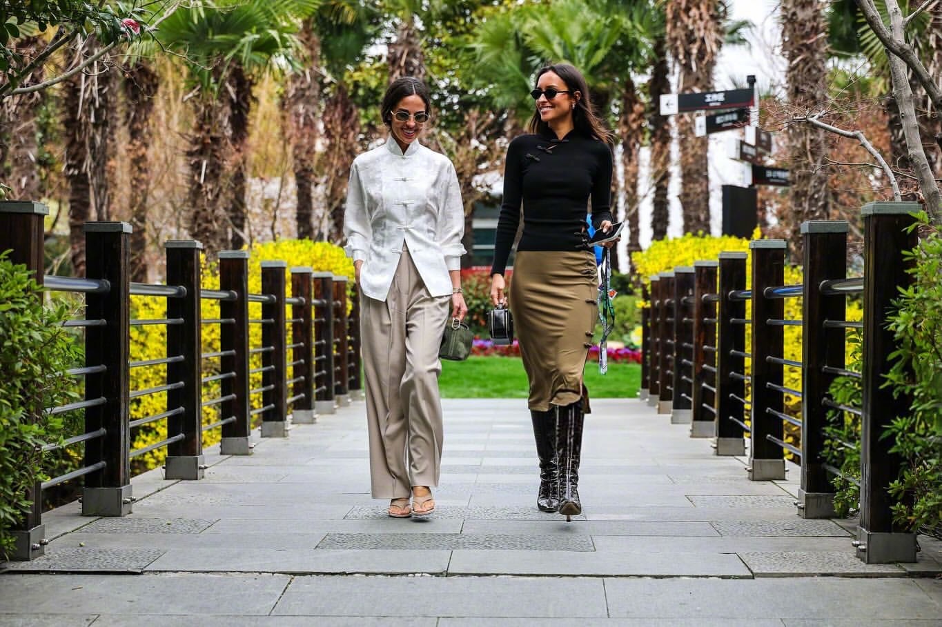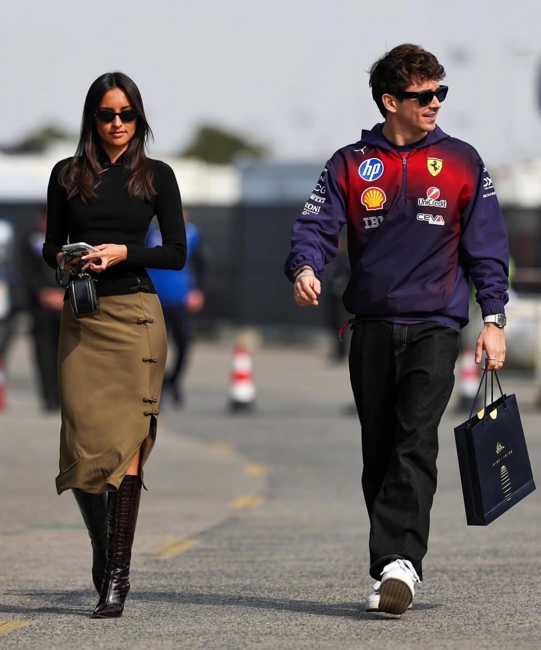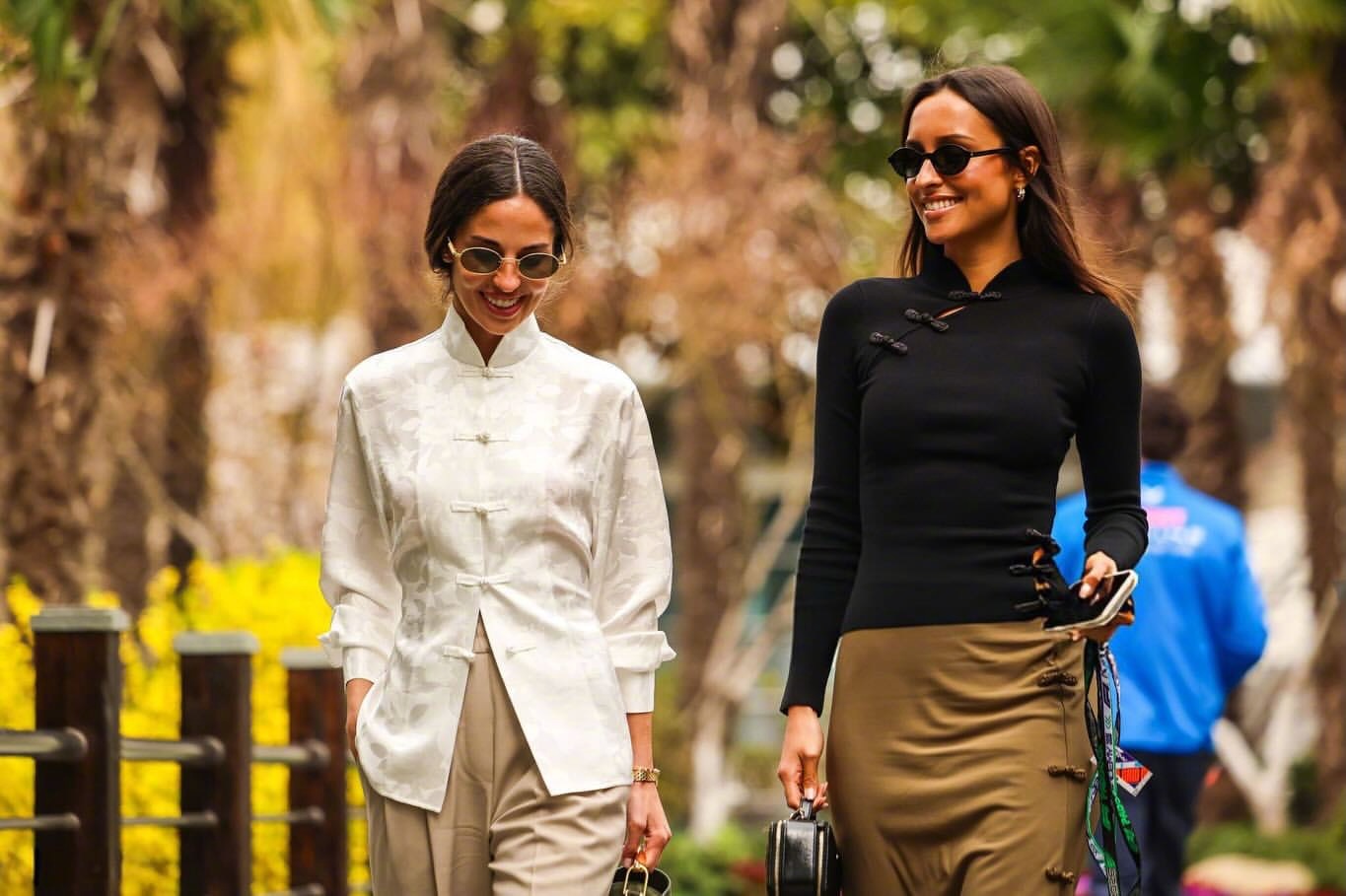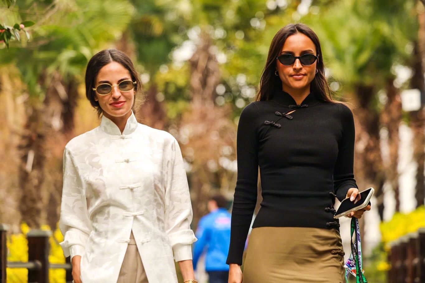 F1赛车手夏尔·勒克莱尔Charles Leclerc 的新婚妻子 Alexandra Saint Mleux 亮相2026年F1中国大奖赛(即上海F1)。继续身穿中式风格服装。一件黑色改良版的紧身上衣配搭盘扣半裙。奶茶🥤也喝起来了。另一位Carmen 穿的是米白色真丝缎中式上衣。