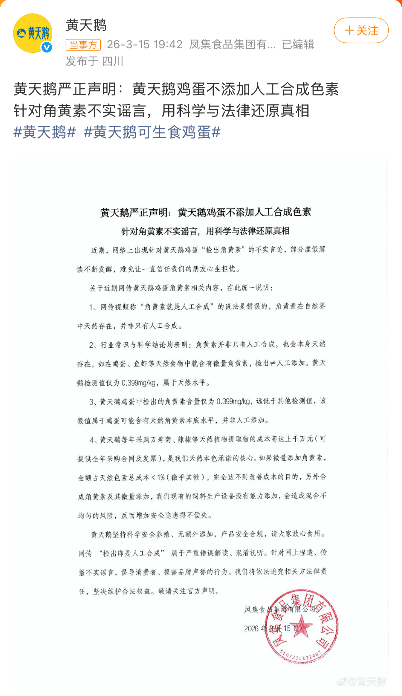 黄天鹅发声明了……网传“检出即是人工合成”属于严重错误解读、混淆视听。黄天鹅坚持科学安全养殖、无额外添加,产品安全合规,请大家放心食用。