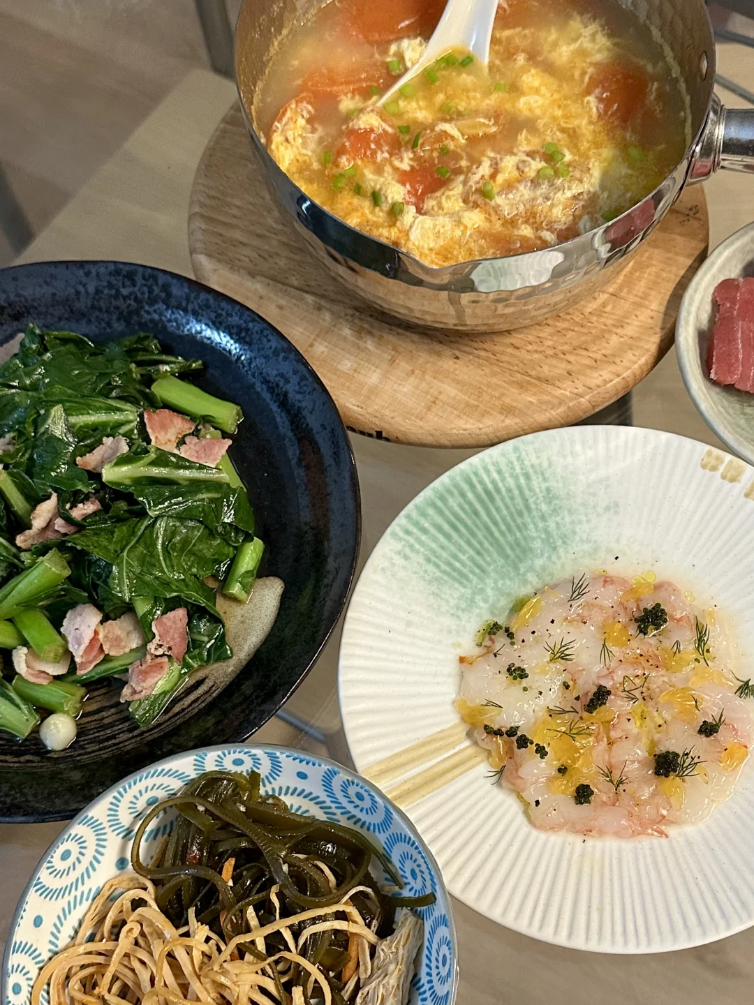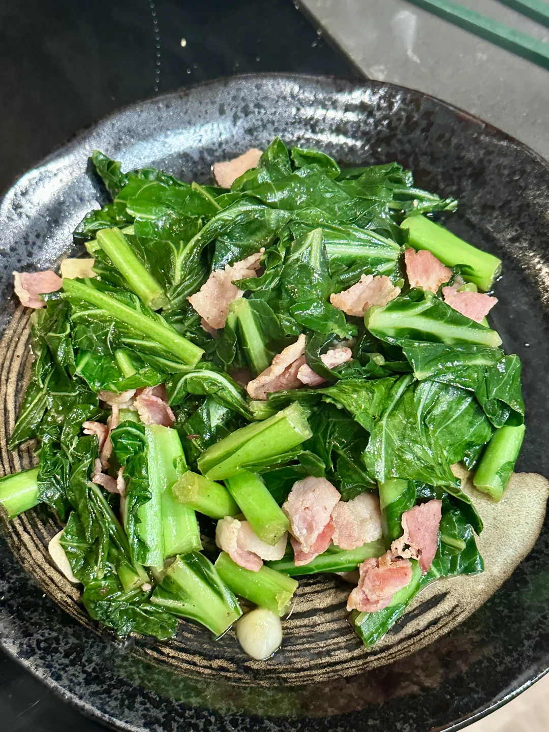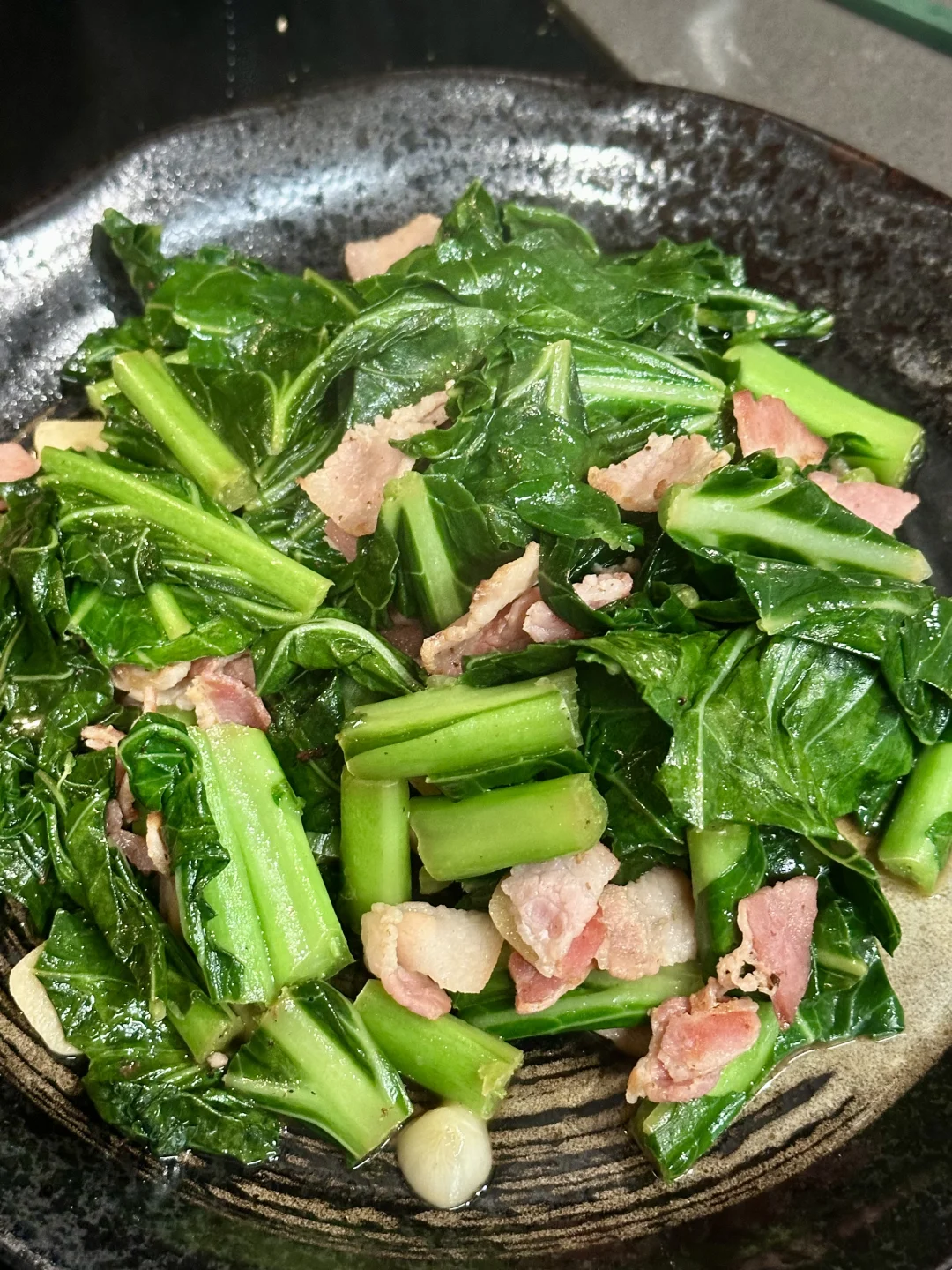 还别说,这样炒出来的collard green,完全不亚于酒香芥兰。保留了鲜绿的色泽和脆嫩的口感,甚至因为肉类油脂的释放,看起来更有食欲。快炒去除了涩味,加了肉味道就不寡,吃口还带点回甘。