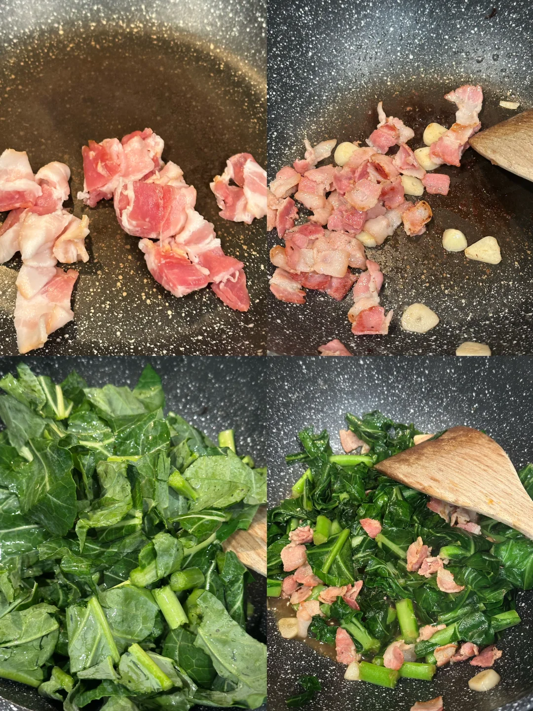 collard green洗净切段,大蒜拍碎切片,腊味切小块备用;