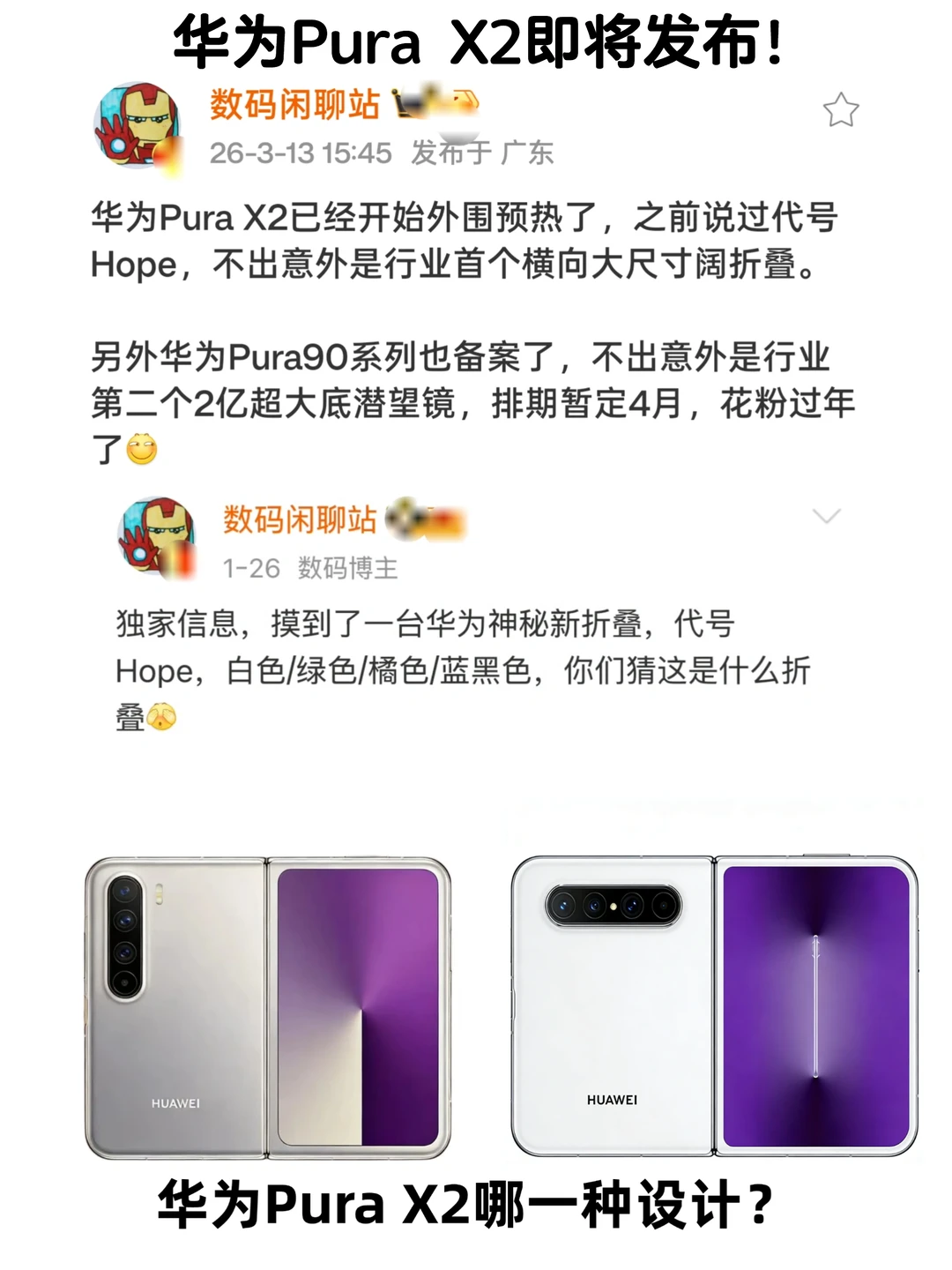 阔折叠屏的引领者是华为吧,之前不被看好的华为Pura X已经卖了一百万台了,如今PuraX2马上就要发布了,代号hope,据说尺寸更大,是行业首个横向大尺寸阔折叠。 配置应该升级很大,5000➕大电池、新长焦、红枫镜头、麒麟9030等等,有四个配色,白、绿、橘、蓝黑,目前外观还没有准确爆料。 据说苹果折叠屏也是类似的大尺寸阔折叠,9月发布,但阔折叠还是得看华为吧[doge]