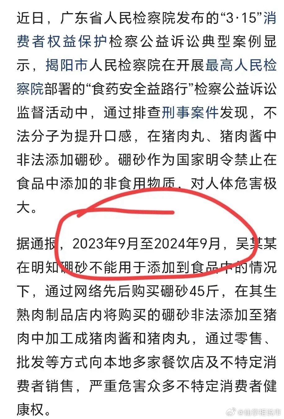 如果天天315就好了,一看都是一两年前的事,在肉丸添加硼砂增加弹度,在油柑添加三氯蔗糖增加甜度。就像影视剧不到公映那天,剧组人员不能剧透一般,很多消费者傻傻吃了好多年,到今天才知道掉进了陷阱。学习一下辨别方法:硼砂肉丸表面光滑,颜色鲜艳,弹力大;正常肉丸表面粗糙,有肉粒纹理,按一下有凹陷,缓慢回弹。正常油柑先酸后甘,如果油柑入口即甜,没有一丝酸涩,那就要高度警惕了。
