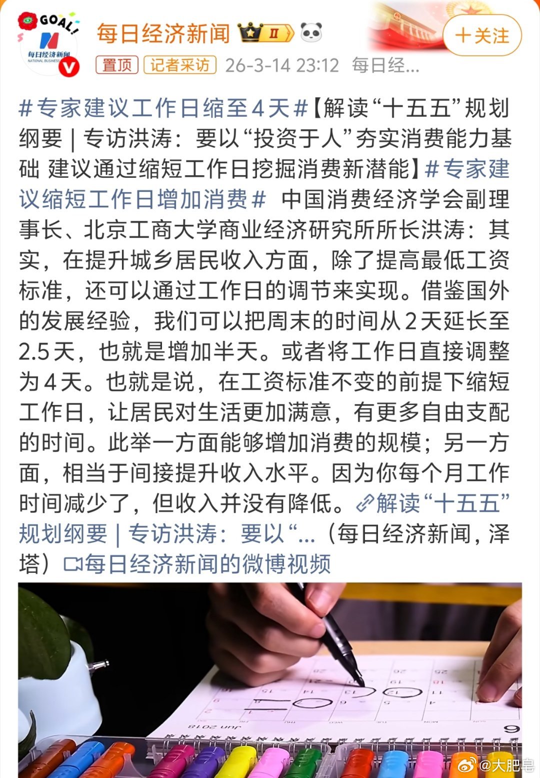 专家建议工作日缩至4天为什么不可以工作日只有三天呢?甚至我觉得可以上二休五也不