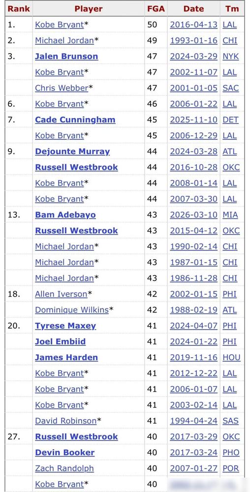 五天前热火打奇才,阿德巴约搞出大新闻。 全场轰83分,挤掉科比81分,成NBA单场得分第二高。出手43次,排历史第13位。 但这数据看着有点虚。43次出手里,罚球就占了43次,比奇才全队罚球次数还多。投篮20中43,三分7中22,命中率实在拿不出手。 科比退役战50次出手砍60分,那是纯靠硬投堆出来的,现代NBA这纪录守了十年多没人碰。张伯伦那63次是远古没三分的时代,没可比性。 有人说他效率远不如科比81分,这话没毛病。阿德巴约自己说要追科比,就看他下次能不能不靠罚球刷数据了。