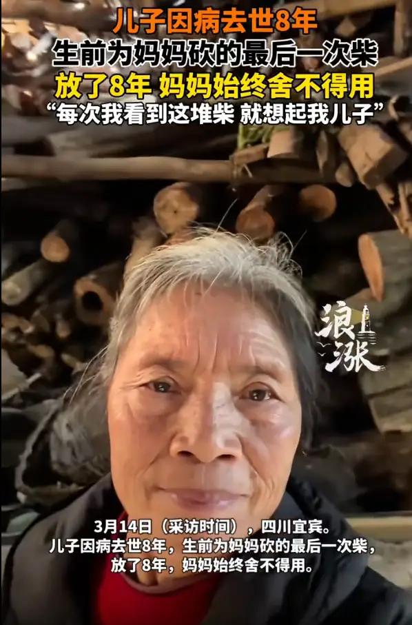 四川宜宾,一位老人晒出和一堆柴的合影看哭网友,原来,这些柴是儿子生前最后一次为妈妈砍的,儿子离开了8年,老人就把这些柴放置了8年,每次看到这些柴,就感觉想起了儿子。 八年前,儿子像往常一样,出门打工前默默上山,劈好、码齐整整一年的柴火,留给母亲取暖做饭。他总记挂着母亲年迈,扛不动重活,便用最实在的力气,把牵挂码成一垛安稳。谁也不曾料到,这竟是他留给母亲最后的孝心。此后,儿子因病离世,这堆柴便成了他留在世间最温暖的痕迹。 八年时光,风吹日晒,木色渐白,树皮微裂,老人却从未舍得动用一根。邻居多次劝说,让她把柴烧了,老人总轻轻摇头。在她心里,这不是柴,是儿子回家的模样,是每次临行前的叮嘱,是摸得到、看得见的陪伴。 老人说,每次看见这垛柴,就想起儿子过年回家的样子,仿佛他还在身边,从未走远。照片里,老人对着柴堆浅浅微笑,眼里却盛满思念。那笑容让人心疼,也让人懂得:最深的爱,从不用言语,都藏在一粥一饭、一柴一木的日常里。