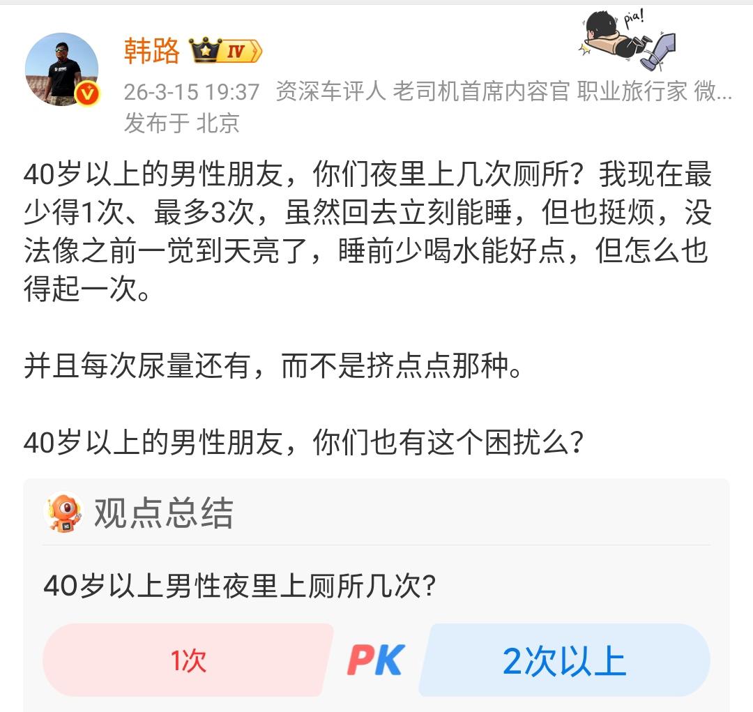 韩路:40岁以上的男性朋友,你们夜里上几次厕所?我现在最少得1次、最多3次! 这个东西和自己的生活习惯以及喝多少水有非常明显的关系,好像是年龄越大觉越少,上厕所就越频繁。 稍微年轻一点就是想睡就睡,年龄大了,想的事情也多,压力越大,就不容易睡着。 各位是怎么看的?欢迎评论区留言。