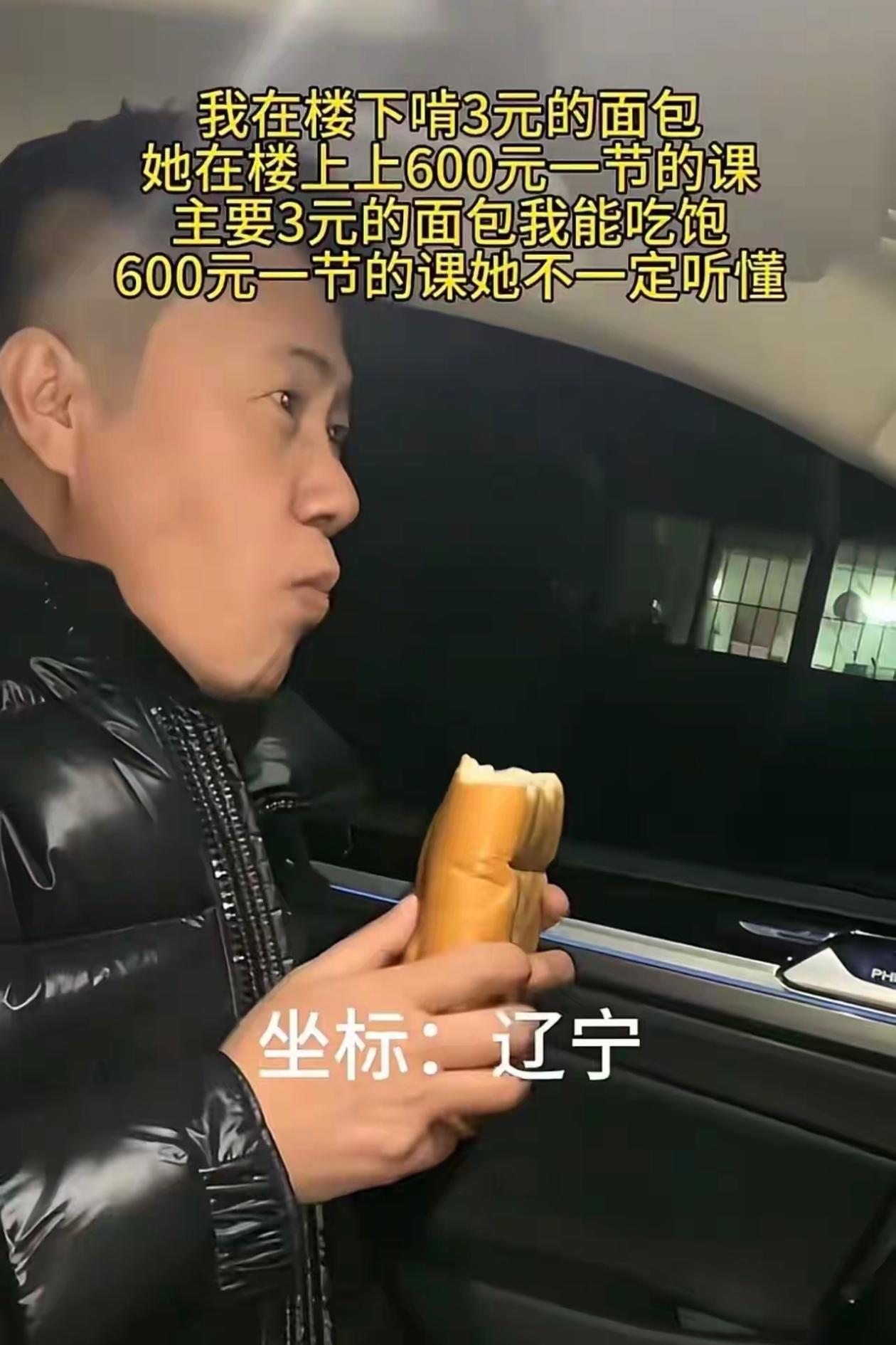 "爱的枷锁。"一男子蹲在楼下啃3块钱的面包,他女儿正在楼上上着600块一节的补习