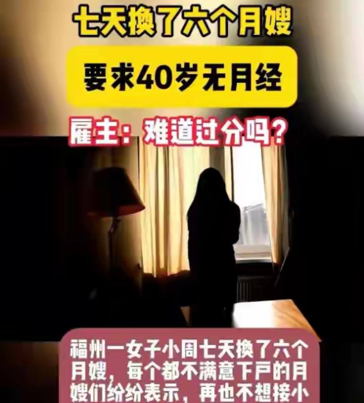 "苛刻,从不嫌够。"福建周女士产后找月嫂,开出的条件让家政公司都沉默了:年龄精准